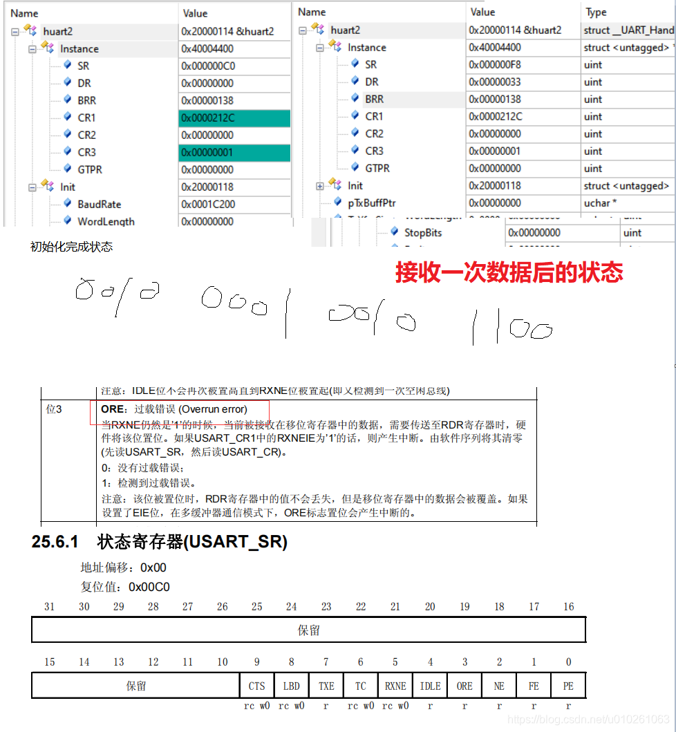stm32 串口笔记问题利用串口中断接收数据,只可以接收到一包数据数据产生问题原因串口产生了ORE过载错误,所以下一次再次使能接收中断,就不可以再次接收解决办法就是清除错误状态和数据寄存器__HAL_UART_CLEAR_OREFLAG(&huart2);//状态寄存器读取一次即可以实现清零清除状态以后再次使能中断接收HAL_UART_Receive_IT(&huart2,uart