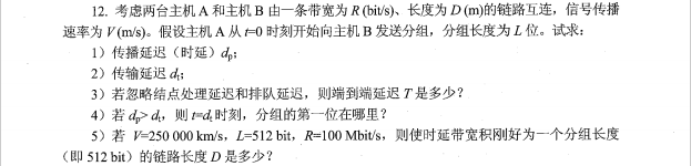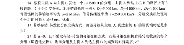 2) (3传播时延+1传输时延+0处理时延+0排队时延-由题意认为之前没有队列)该分组从主机 A 到达主机 B 的端到端时延: =L/R+d1/S+d2/S+d3/S =1500×8/2000000+(5000+4000+1000)×1000/250000000=0.006+0.04=0.046s=46ms