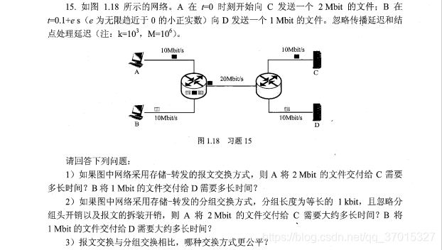 从t=0.1s时刻起与B共享连接路由器的链路,平均各共享到带宽10Mbps,A大约再用时:1/10+2×1000/10000000=0.1002s交付剩余的1000个分组,故A向C交付2Mbits文件大约需要(0.1+0.1002)s≈0.2s;