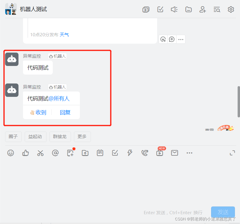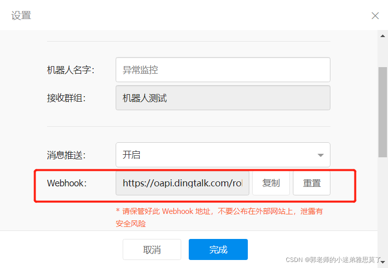 例如添加了一个自定义关键词:监控报警,则这个机器人所发送的消息,必须包含监控报警这个词,才能发送成功。