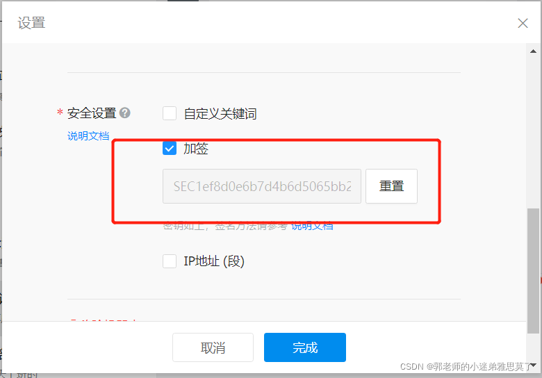 密钥,机器人安全设置页面,加签一栏下面显示的SEC开头的字符串。