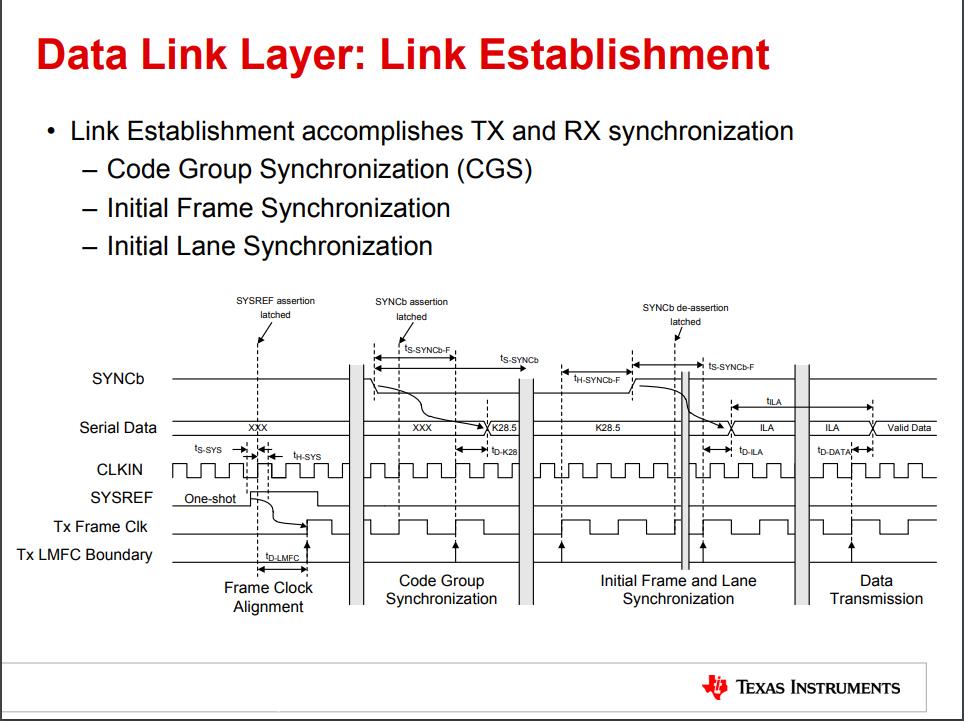 JESD204B通过三个阶段来建立同步链路:代码组同步(code group synchronization, CGS),初始化通道同步(initial lane synchronization, ILAS),数据传输阶段(data transmission phase)。