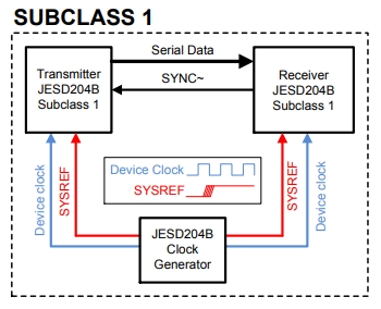 Subclass 1 uses device clock, lanes, SYNC~, and SYSREF(子类1有SYNC~和SYSREF信号);