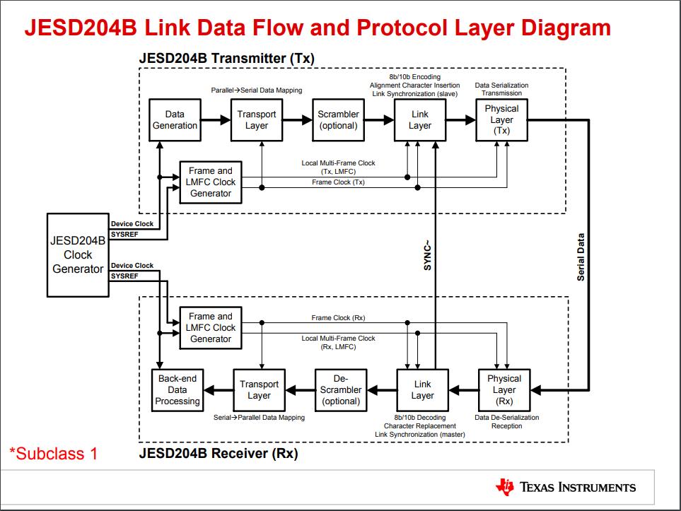 图中显示了一个基本的JESD204B(Subclass 1)的架构,时钟产生器给收发双方提供Device Clock及SYSREF信号;发送方通过串行接口发送数据至接收方,接收方通过SYNC~信号控制发送进程。