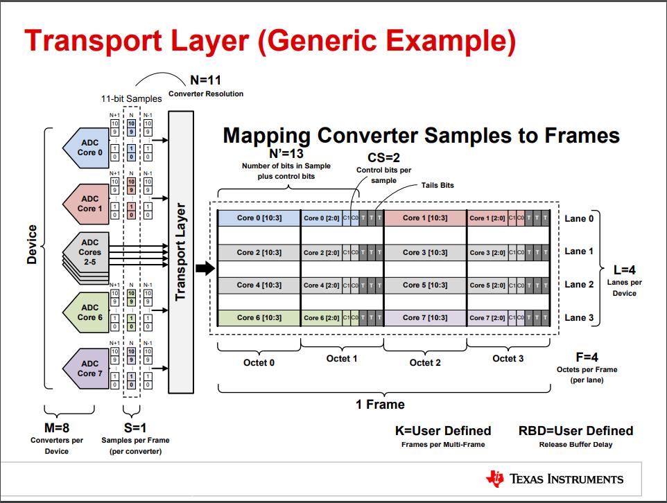 M=8表示共有8路ADC;S=1表示一帧中包含了1次采样;N=11表示ADC采样精度为11;N'=13表示采样精度11bits+控制位2bits;CS=2表示控制位为2bits;L=4表示Lane的数量为4;F=4表示每个Lane的每个帧有4个字节;K=User Defined表示由用户定义的每个多帧里面有几个帧;Control bits用于表示ADC是否溢出或;Tails Bits用于填充,可以固定为0或填充伪随机序列;