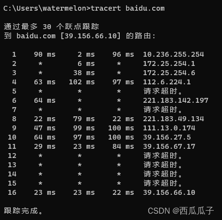 Tracert命令用来显示数据包到达目标主机所经过的路径,并显示到达每个节点的时间。命令功能同Ping类似,但它所获得的信息要比Ping命令详细得多,它把数据包所走的全部路径、节点的IP以及花费的时间都显示出来。该命令比较适用于大型网络。