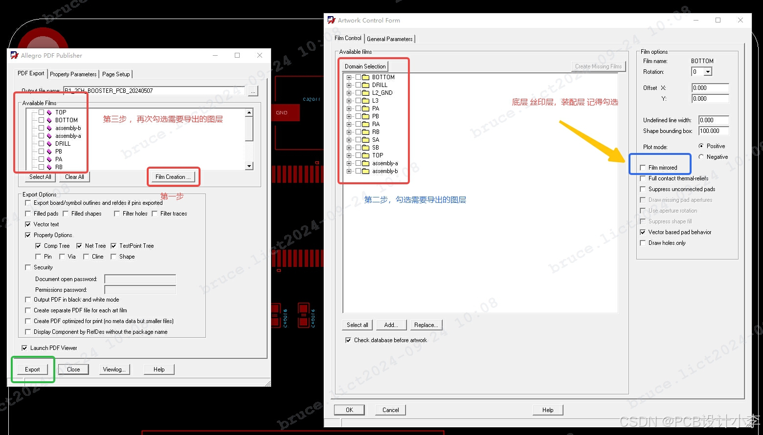 然后按照下图步骤进行( 注意第一步,点击 film creation, 进入artwork 中,有人会疑惑为啥点这个,因为有些图层需要镜像设置,在第一个界面没法设置,需要到artwork 中 勾选 Film mirrored ),