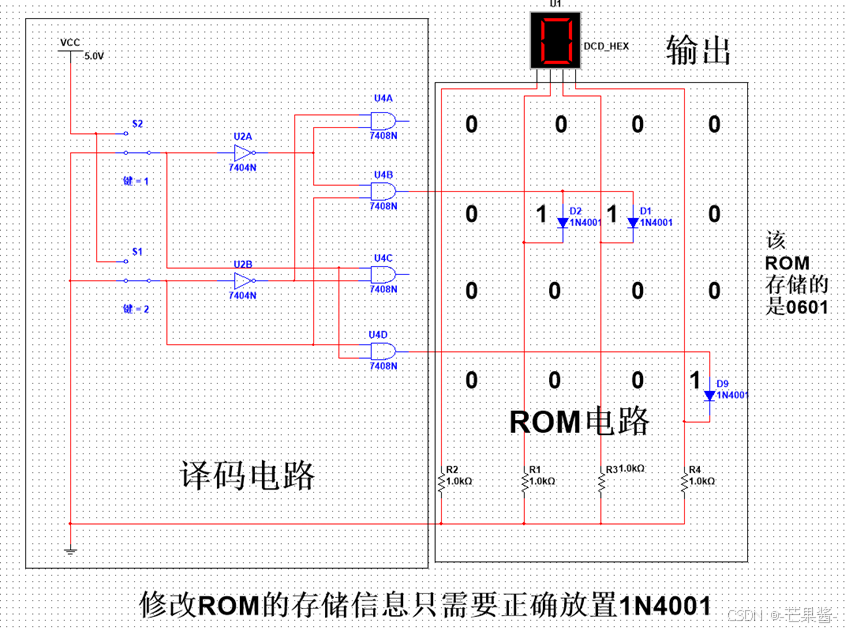 电路如图2-0所示。存储器有四个字,每个字4位,依次存放了1011B,1001B,1110B,0011B。
