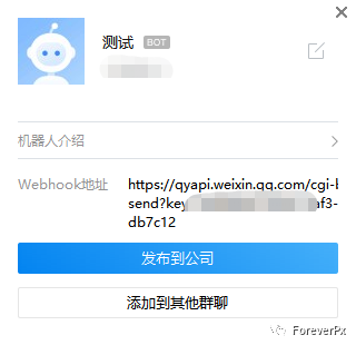 从把办公通信工具从微信迁移到企业微信后,群组里面多了一个叫“群聊机器人”的功能,如下图,我在某个群建了一个叫“测试”的机器人。