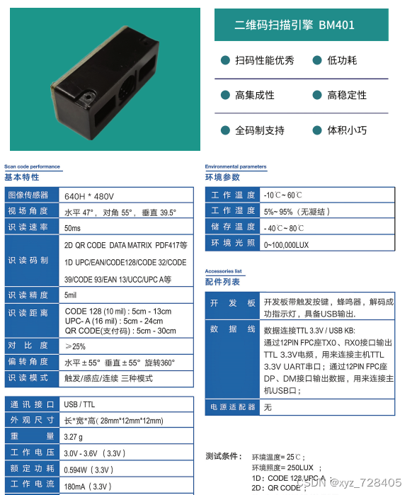 BM401二维码扫描引擎,产品采用针对条码识别的专业图像处理芯片,能够在复杂环境