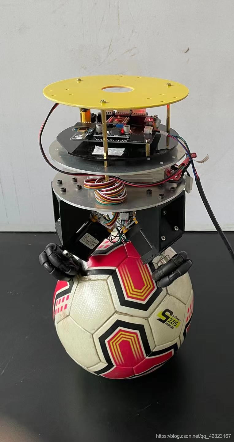 毕业设计——球上平衡机器人前言本次毕业设计过程中,受到过许多人的帮助,收获良多,在此将机器人整体开源,同时总结一下机器人搭建过程中遇到的坑和未来的改进方向。一、机器人原理分析首先来看成品图如图所示,该机器人根据陀螺仪的位姿数据,通过三全向轮驱动底部球体调整自己在球上的位置,保持动态平衡的同时实现全向移动。二、硬件清单材料价格数量淘宝链接56mm全向轮45元/个3https://m.tb.cn/h.