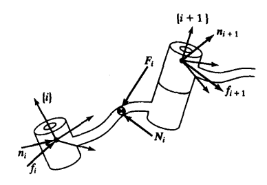 每个连杆都受到相邻连杆的作用力和力矩以及附加的惯性力和力矩,如图典型连杆在无重力状态下的受力图所示,图中 f i \boldsymbol{f}_i fi表示连杆 i − 1 {i-1} i−1作用在连杆 i i i上的力, n i \boldsymbol{n}_i ni表示连杆 i − 1 {i-1} i−1作用在连杆 i i i上的力矩。