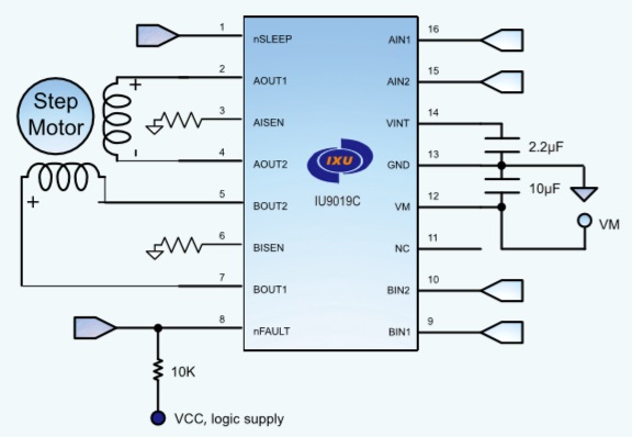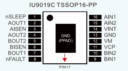 IU9019C为玩具、打印机和其它电机一体化应用提供一种双通道电机驱动方案。IU9019C有两路H桥驱动,可以驱动两路刷式直流电机,一个双极步进电机,多个螺线管或者其它感性负载。每个H桥的功率输出模块由N沟道功率MOSFET组成,用于驱动电机绕组。每个H 桥均具备调节或限制绕组电流的电路。该器件利用故障输出引脚实现内部关断功能,提供过流保护、短路保护、欠压锁定和过热保护,并提供了一种低功耗休眠模式。另外提供一个错 误输出管脚nFAULT,当过流过温保护的时候,nFAULT为低电平.