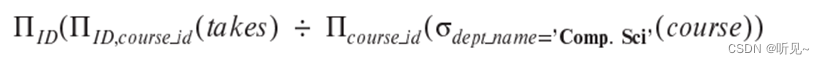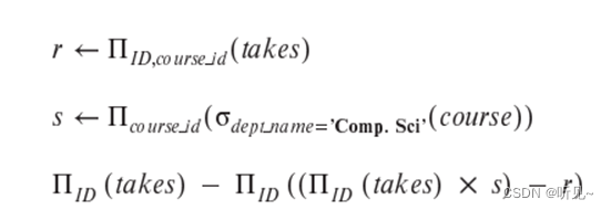 a. 使用除法运算符编写关系代数表达式,找到所有已经修读所有计算机科学课程的学生的ID。(提示:使用投影操作选择仅包含ID和课程ID的元组,并使用选择表达式生成所有计算机科学课程ID的集合,然后进行除法运算。)