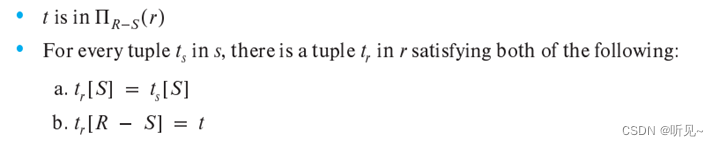 2.9 关系代数的除法运算符“÷”的定义如下。设r(R)和s(S)代表关系,且S ⊆ R,即模式S的每个属性也在模式R中。给定一个元组t,令t[S]表示元组t在S属性上的投影。然后r ÷s 是在模式 R - S上的关系(即在包含模式R中所有不在模式 S中的属性)。元组t在r ÷ s中当且仅当满足两个条件: