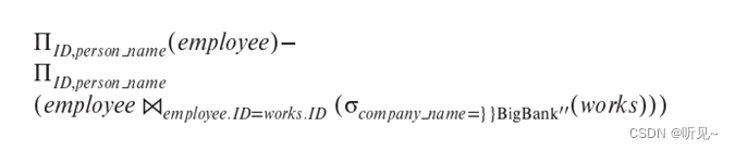 a.要找到不在BigBank工作的员工,首先找到所有在BigBank工作的员工。这正是不在期望结果中的员工。然后,我们使用集合差异找到所有员工的集合减去不应在结果中的那些员工。