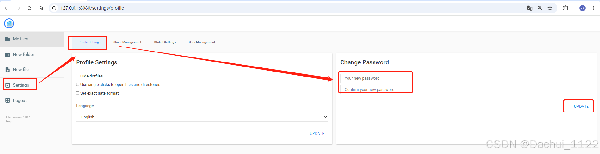 在 filebrowser 管理平台中,用户可以修改显示语言、默认密码、添加用户等