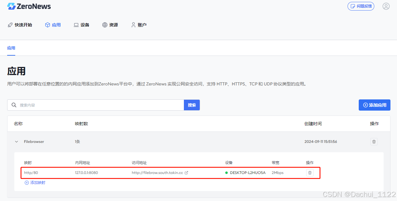 Filebrowser 映射添加完成后,可在应用详情中可查看添加好的映射列表.