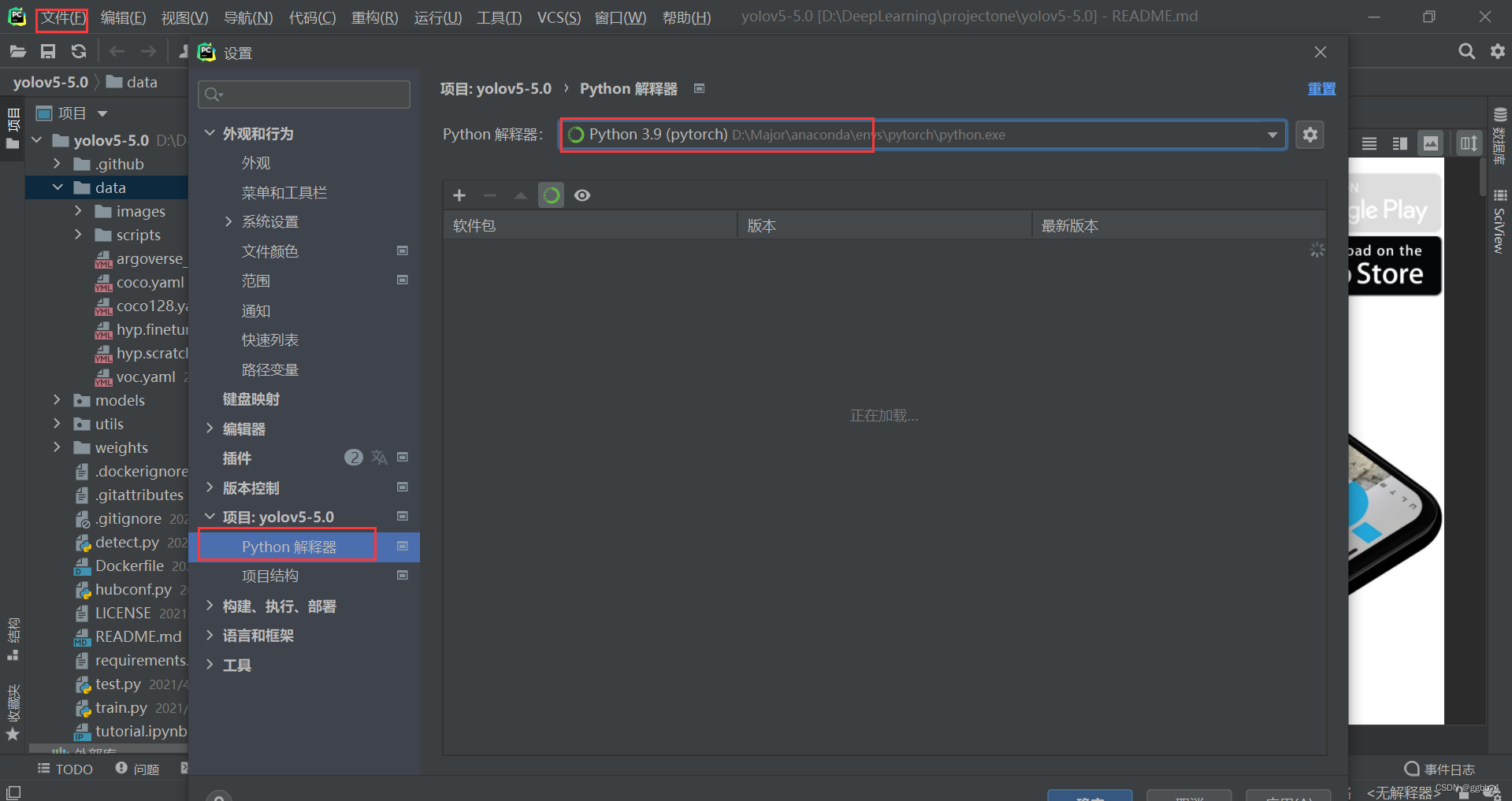 配置环境: 点击【文件】->【设置】->【Python解释器】,选择相应的环境【我的是:pytorch】