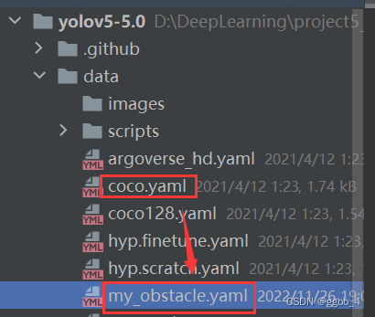 1.在【data】中,复制coco.yaml,直接ctrl+c,然后ctrl+v,重命名为【my_obstacle.yaml】,名字可任意,然后保存在【data】下