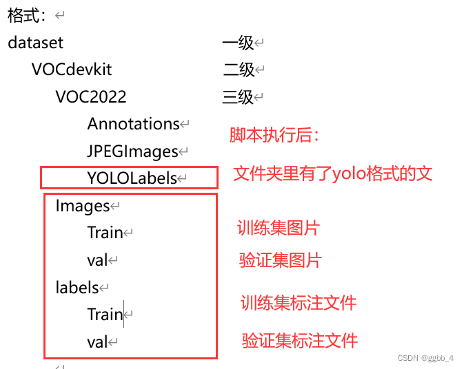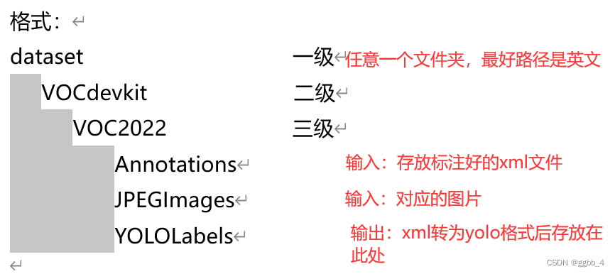 1.首先创建VOC格式数据集文件格式:先对格式做个说明:这里是划分前的文件夹形式,自己按照如下格式创建好文件夹:(说明:dataset是我D盘下的一个文件夹,这里自己定,我没有把VOCdevkit数据集文件夹放到yolo项目根目录中)