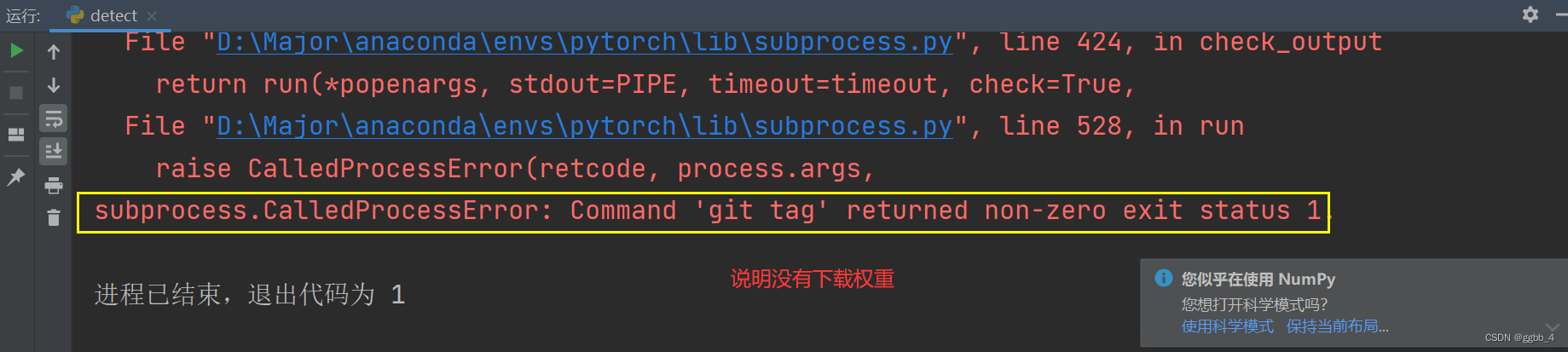 2.找到【detect.py】,右击运行,报错如下: