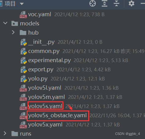 2.在【models】文件夹下复制yolov5s.yaml,重命名为【yolov5s_obstacle.yaml】,名字可任意,然后保存在【models】下