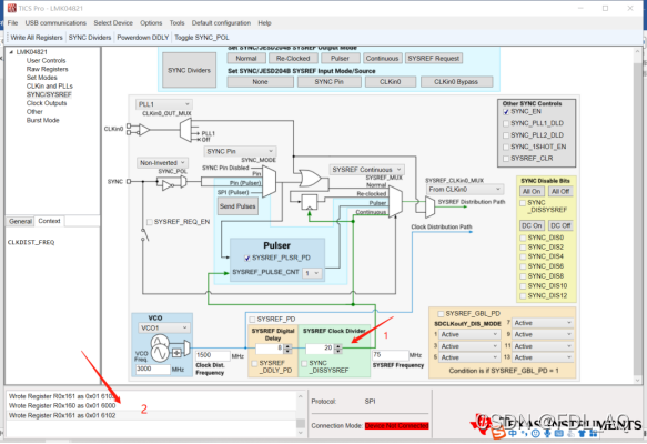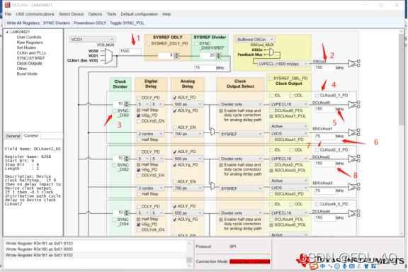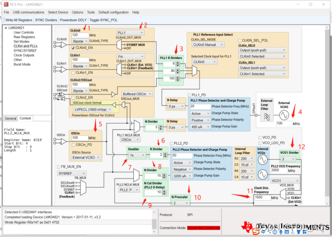 在此之前,确定寄存器配置顺序之后,利用辅助软件TICS Pro软件产生对应的参数,按照6中所示的寄存器顺序进行写操作。软件使用中重要参数的产生以及对应在软件中如何设置见图十;