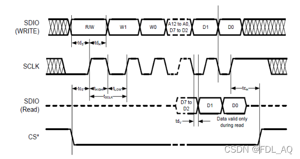 - 写操作时,CS信号为低电平时,SDIO的数据在SCK上升沿写进芯片,写数据格式为1bit的读写控制位+2bit的0+13bit地址+8bit数据。