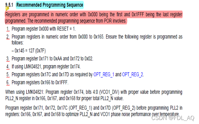 在进行LMK04821寄存器配置的时候,手册里给了一个推荐的顺序,如图九:
