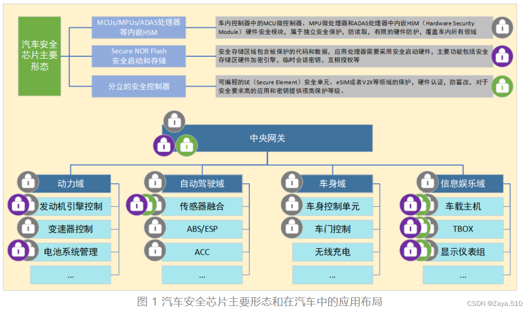 说明:关于汽车安全中可以使用SE安全单元针对外部通信的安全形式,可以是内嵌HSM硬件安全模块对系统内做安全监测,可以是在CPU上搭建trustZone的硬件架构,是将SOC里分出安全区和非安全区的OS。