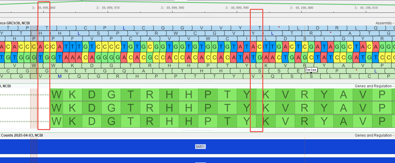 案例:探针:NanoWES_hg38;基因:QARS1;突变位置:chr3:49099957-49099959;经OMIM数据库查询,该基因QARS1与小头畸形、进行性、癫痫发作以及脑和小脑萎缩疾病相关;而NM_005051.3:intron14:c.1295+2_1295+4del这个变异影响到了经典剪接位点,所以,需要对该变异是否影响剪接进行再次判断;