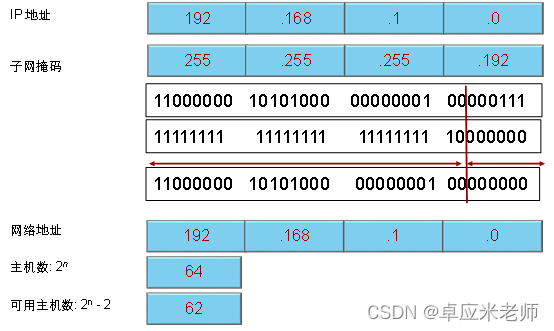 划分后我们可以将网段192.168.2.0/24和192.168.3.0/24释放出来,而且每个部门都预留了地址不担心后期部门扩员。经过上面的过程我们可以总结出子网划分依据是子网掩码的长度,而子网掩码长度取决于借位后网络位的位数。