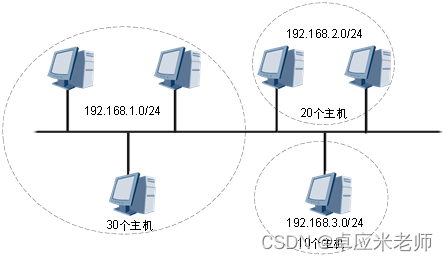 按照定义好的网络长度划分的A类、B类、C类等网络分类,称为有类网络 ,有类网络由于采用固定格式,正因为这一点使用缺省子网掩码就会存在一定的局限性,如果企业网络中希望通过规划多个网段来隔离物理网络上的主机,网络中划分多个网段后,每个网段中的实际主机数量可能很有限,导致很多地址未被使用。C类地址的缺省子网掩码为24位,支持的网络最多,同时也限制了单个网络中主机的数量。1、某公司申请到一个C类地址段,需