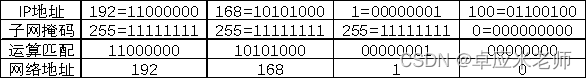 通常给定一个IP地址需要计算其归属网段,我们可以将IP地址和它的子网掩码进行与运算得出网络地址。运算法则为同为1时为1,其他情况为0。与运算举例如下表所示。