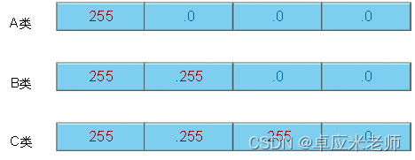 如下图每类IP地址有一个缺省子网掩码。A类地址的缺省子网掩码为8位,即第一个字节表示网络位,其他三个字节表示主机位。B类地址的缺省子网掩码为16位,因此B类地址支持更多的网络,但是主机数也相应减少。C类地址的缺省子网掩码为24位,支持的网络最多,同时也限制了单个网络中主机的数量。