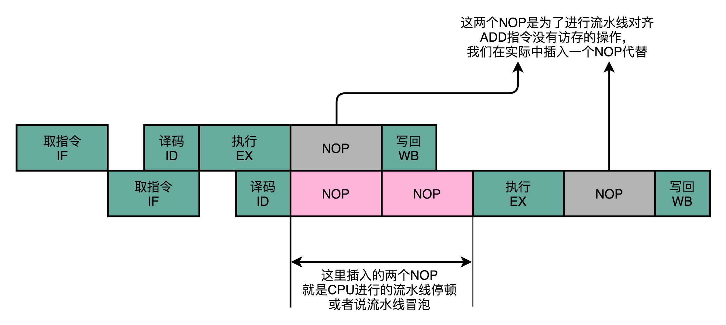 所以,在实践当中,各个指令不需要的阶段,并不会直接跳过,而是会运行一次NOP操作。通过插入一个NOP操作,我们可以使后一条指令的每一个Stage,一定不和前一条指令的同Stage在一个时钟周期执行。