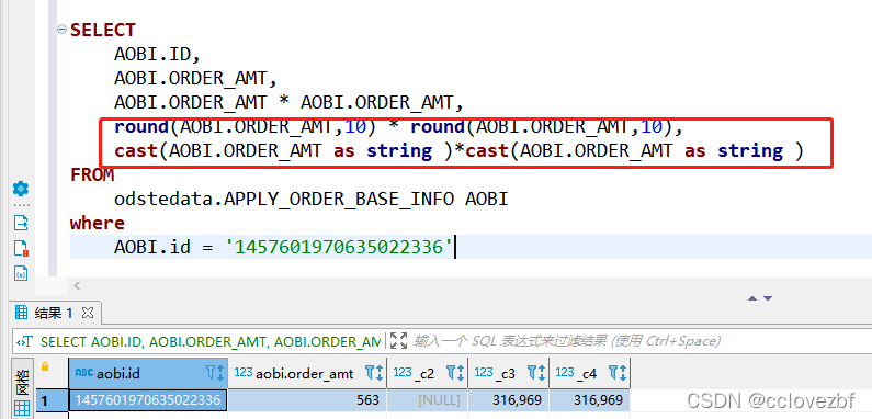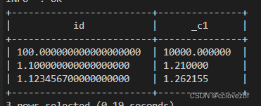 我们设置的decimal(38,18)乘以decimal(38,18) 为了确保精度不变,变成了decimal(38,36),再仔细看下数据 发现c2就是直接相乘那一列,有的有值有的没有值,有值的整数都只有两位,与结果对应上了。