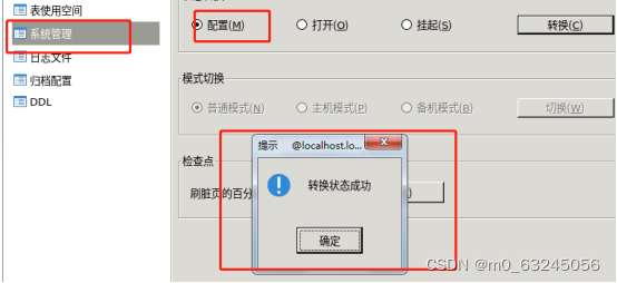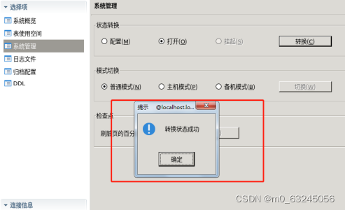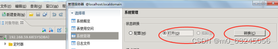 右键左边红框内容【192.168.59.68(SYSDBA)】,在左键点击【管理服务器】,点击【打开】,再【转换】,并提示转换成功