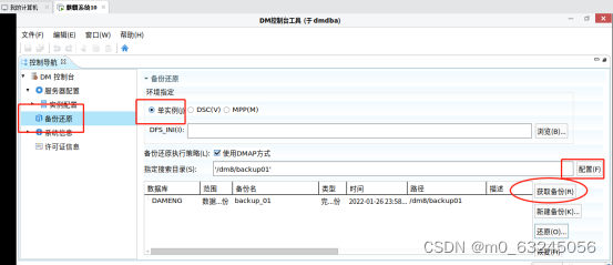 5)去到/dm8/tool文件夹下,启动 ./console 控制台工具,选择【备份还原】,点击右图【单实例】,【勾选】使用DMAP方式,点击【配置】选取全备份文件所在的路径