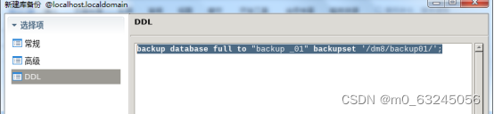命令:backup database full to “backup_01” backupset ‘/dm8/backup01‘;