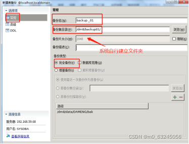 左击【常规】出现下图内容,【备份名】填写backup_01,【备份目录】填写/dm8/backup01/ ,【备份类型】选 【完全备份】