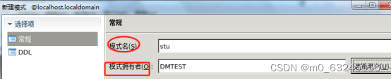 2.在【新建模式】中,【模式名】填写stu 【模式拥有者】填写DMTEST,如下图: