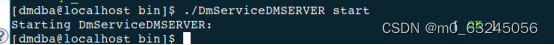 9)进入/dm8/bin 目录,启动数据库实例 ./DmServiceDMSERVER start,具体如下图: