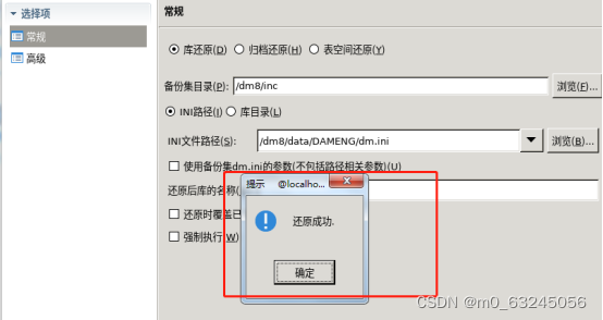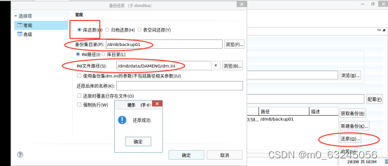 6)点击右图【还原】,弹出左边对话框选择【库还原】,【备份集目录】填写全备路径/dm8/backup01,【INI文件路径】填写dm.ini 路径/dm8/data/DAMENG/dm.ini