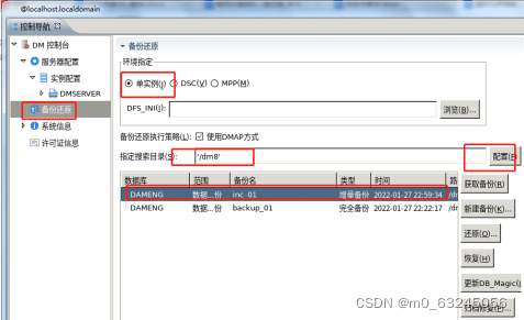 1)启动【console工具】,点击左边【备份还原】,点击【单实例】,【配置】-选择【/dm8】,再点击【获取备份】,就出现下图显示内容,我们选择【inc_01】