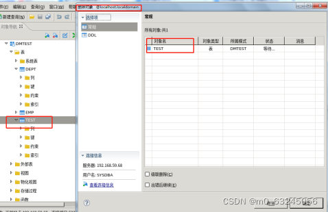 1)右键【TEST】表,点击【删除】,出现右边界面,再点击【确认】,就删除TEST表示,如果报错可点击【级联删除】尝试