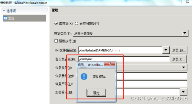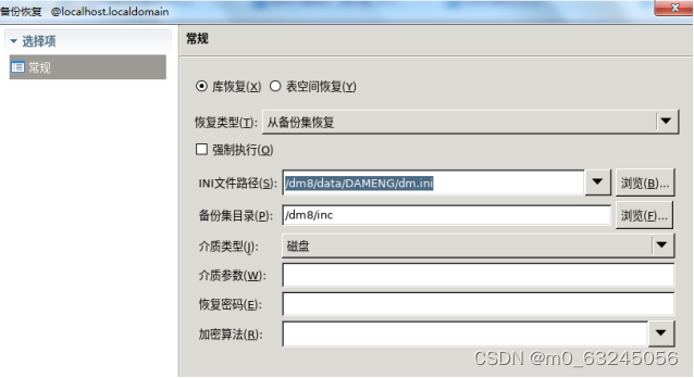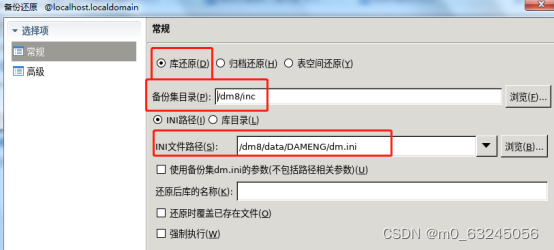 7)点击右图【恢复】,弹出左图选择【库恢复】,【INI文件路径】填写/dm8/data/DAMENG/dm.ini,【备份集目录】填写全库备份目录 /dm8/backup01