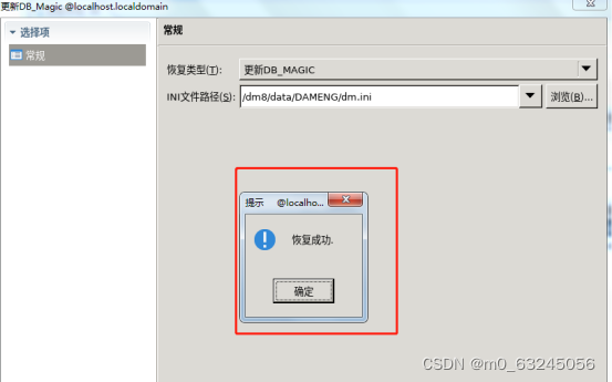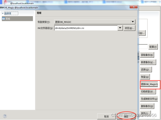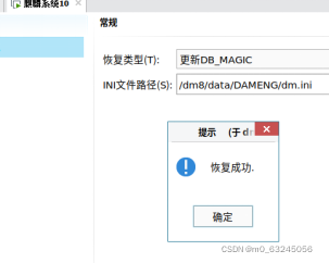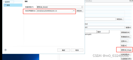 8)点击右图【更新DB_MAGIC】,弹出左图在【INI文件路径】填写/dm8/data/DAMENG/dm.ini,最后点击【确认】