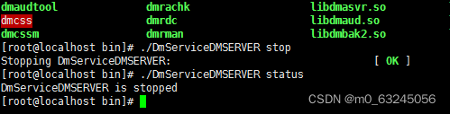 4)去到/dm8/bin 文件夹下,启动./DmServiceDMSERVER stop 停止数据库实例;并再执行 ./DmServiceDMSERVER status 查看实例状态